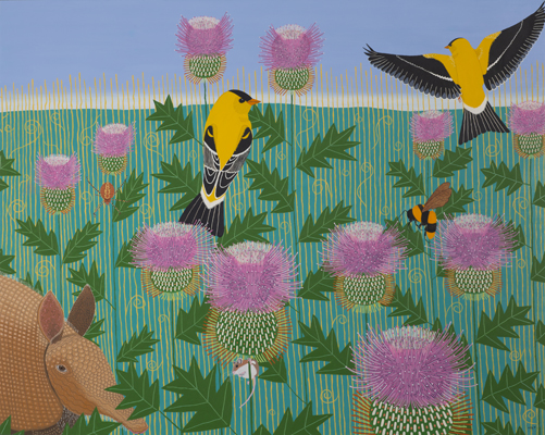 Cindi Holt Goldfinches with a Bee 2025 oil on panel Goldfinches_with_a_Bee